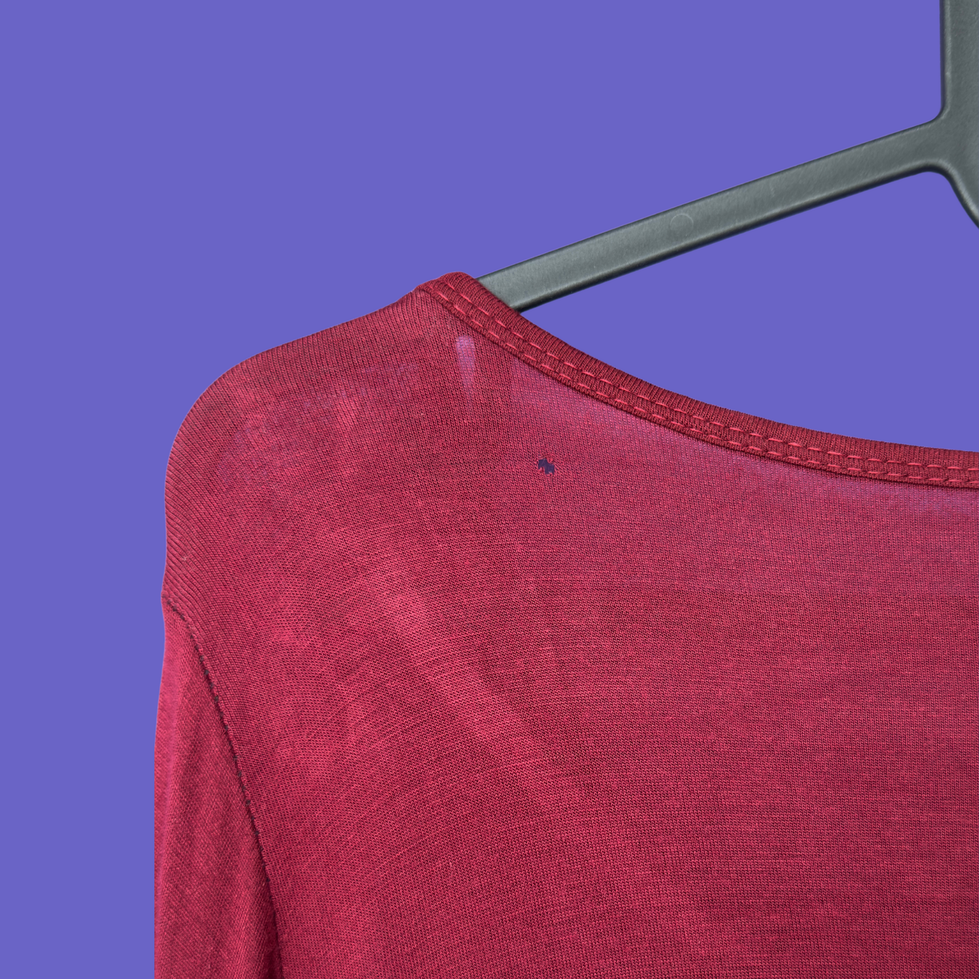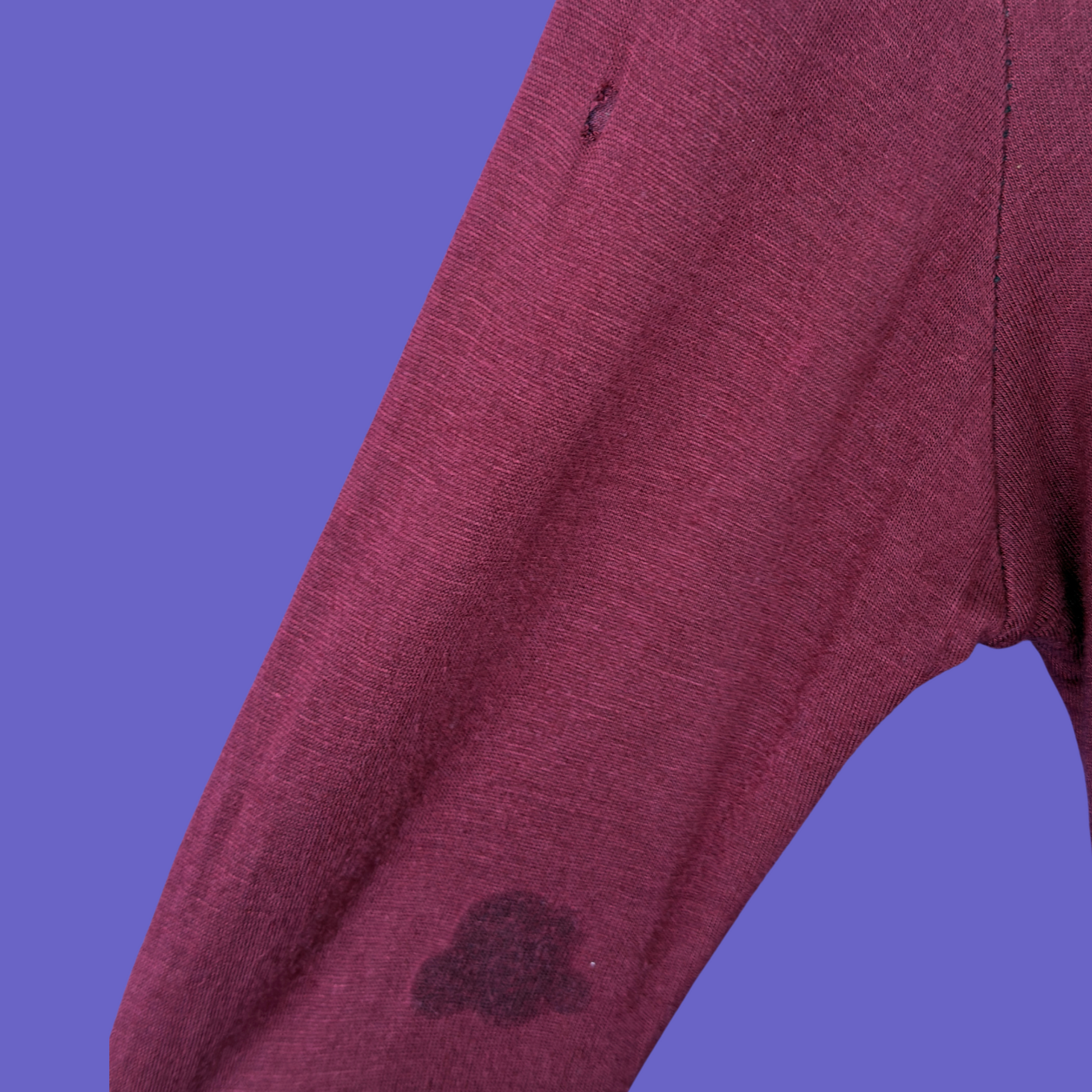 (Note - Minor stain on back sleeve + a tiny hole near the back shoulder (see pictures — priced accordingly).