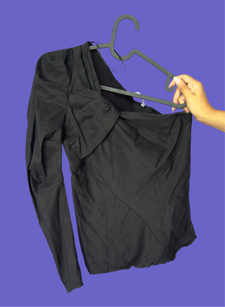 The Off-Shoulder Asymmetric Black Top is an asymmetric black statement piece with one full sleeve and a gathered detail across the bust. With its dramatic silhouette and fitted bodice, this top brings bold energy to any evening look — pair it with high-waisted pants or a mini skirt for maximum impact.